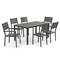 Zahradní sestava AZS-B1656 GREY nabízí praktické řešení pro venkovní posezení s rodinou či přáteli. Stůl o rozměrech 156 × 78 cm má desku z polywoodu, materiálu odolného vůči povětrnostním vlivům a snadno udržovatelného, který věrně imituje vzhled dřeva. Pevná kovová konstrukce v šedém odstínu zajišťuje stabilitu a dlouhou životnost celé sestavy. Součástí je šest židlí s kovovým rámem a sedáky i opěradly tvořenými voděodolnými lamelami, které doplňují celkový design a poskytují pohodlné sezení. Díky kombinaci materiálů je nábytek vhodný pro pravidelné venkovní použití na terasách, zahradách či balkonech.