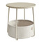 Odkládací stolek s kulatou deskou o průměru 45 cm a výškou 50 cm nabízí praktický doplněk do obývacího pokoje či ložnice. Deska je vyrobena z MDF s kašmírovým dekorem v béžovém odstínu, který působí jemně a neutrálně. Pod deskou je umístěn textilní koš v krémové barvě, který poskytuje prostor pro uložení drobných předmětů a pomáhá udržet pořádek. Kovové nohy v béžovém provedení zajišťují stabilitu a pevnost stolku. Celkový design kombinuje funkčnost s nenápadným moderním stylem vhodným do různých interiérů.