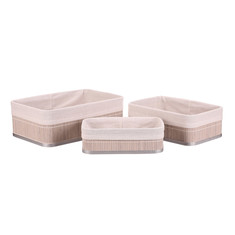 Sada tří regálových košů v hnědém provedení je vyrobena z bambusu a doplněna o textilní vložku v přírodních odstínech. Koše mají pevné dno a hladký povrch, který usnadňuje údržbu a zároveň přináší přírodní vizuální efekt. Různé velikosti košů umožňují efektivní organizaci prostoru v regálech, skříních nebo na policích. Jsou vhodné pro uložení drobných předmětů, které tak zůstanou přehledně uspořádané a snadno dostupné. Praktické a zároveň dekorativní řešení pro každý interiér.