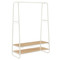 Věšák s dvěma policemi v bílém provedení kombinuje pevnou kovovou konstrukci s praktickými policemi z MDF s dubovým dekorem, které poskytují dostatek úložného prostoru pro obuv nebo doplňky. Stabilní rám je navržen v nadčasovém designu s oblými hranami, což zajišťuje bezpečné a pohodlné používání. Horní část věšáku nabízí dostatečnou délku pro zavěšení oděvů na ramínka, zatímco po stranách jsou umístěny kovové háčky pro zavěšení menších předmětů. Povrchová úprava kovu je hladká a snadno udržovatelná, což přispívá k dlouhé životnosti produktu. Rozměry a nosnost odpovídají běžným požadavkům na domácí i komerční použití.
