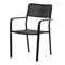Zahradní židle v černém provedení kombinuje pevný kovový rám s odolným plastovým sedákem a opěradlem, které jsou navrženy pro dlouhou životnost a snadnou údržbu. Díky stohovatelnému designu umožňuje efektivní skladování a úsporu místa. Područky zajišťují pohodlné opření rukou během posezení. Jednoduchý a praktický tvar židle se hodí do různých venkovních prostor, jako jsou terasy, zahrady nebo balkony.