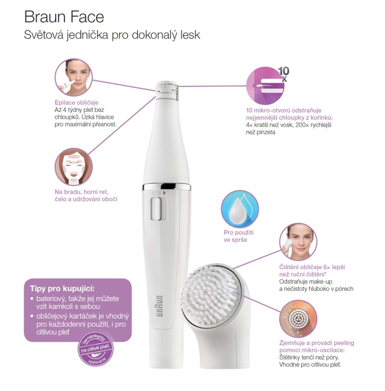 Braun Braun Face 830 je první epilátor na obličej s čisticím kartáčkem na světě. Přesná epilace a hloubkové čištění pórů. S Braun Face 830 můžete využít dvě procedury s jedním přístrojem - stačí vyměnit nástavec.