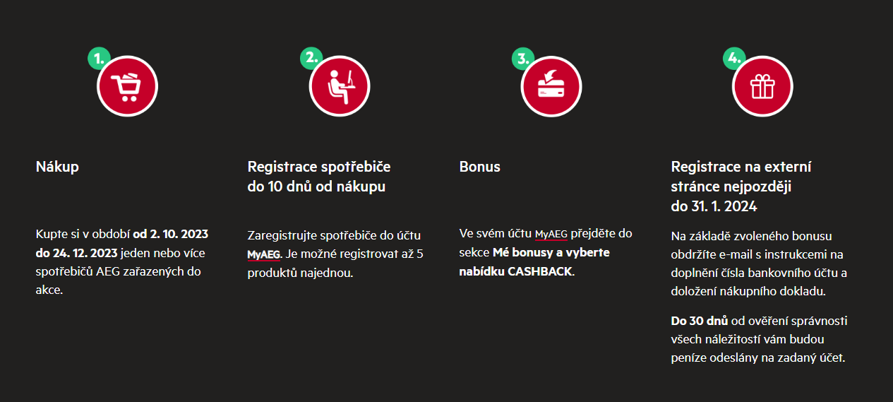 - Cashback získáte registrací zakoupeného spotřebiče, kterou je nutné udělat do 10 dnů od data nákupu na webových stránkách výrobce a zvolit v sekci "Mé bonusy" nabídku "Cashback". Je možné registrovat až 5 produktů najednou.