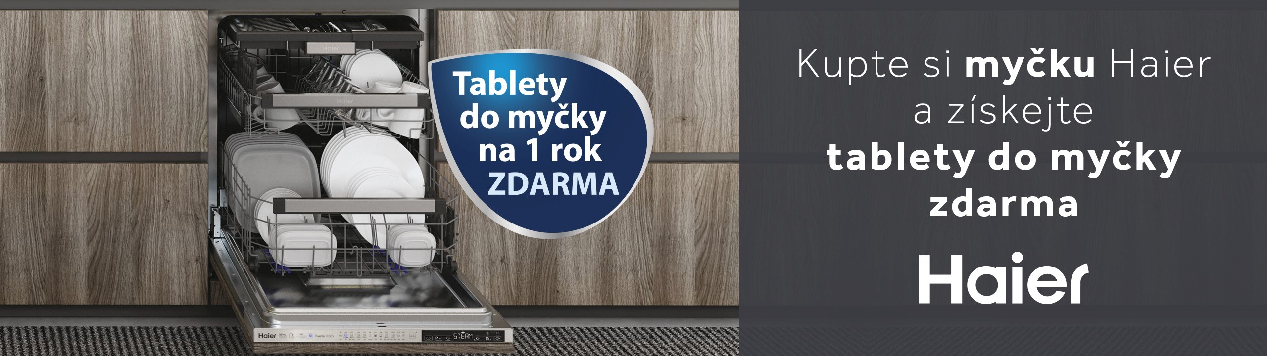 Udělejte si radost novou myčkou nádobí značky HAIER a získejte zdarma tablety do myčky na 1 rok jako dárek.