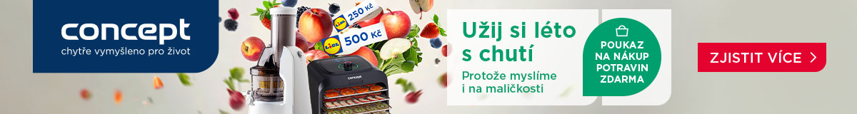 - K vybraným modelům sušiček ovoce a odšťavňovačů CONCEPT získejte poukaz na nákup potravin v řetězci Lidl v hodnotě 250-500 Kč. Platnost poukazu je 12 měsíců.