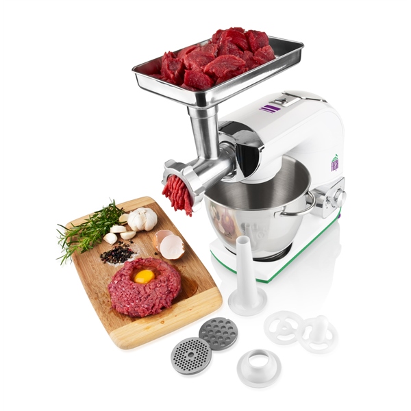 - Mlýnek na maso o průměru 62 mm (4 velikosti mlecích destiček, nástavec na výrobu uzenin, nástavec na výrobu Kebbe, tvořítko na cukroví, pěchovadlo, uvolňovací klíč)