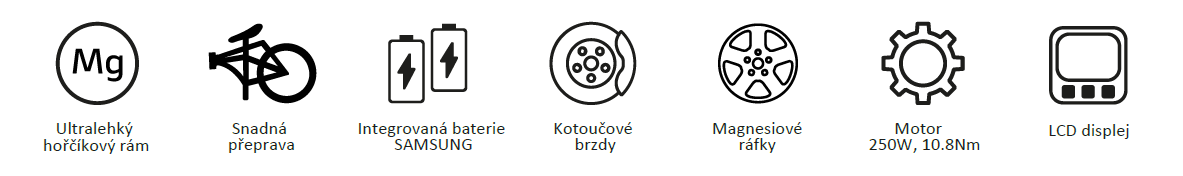- Motor: 36V, 250W, IP54, 10.8Nm, v zadním náboji