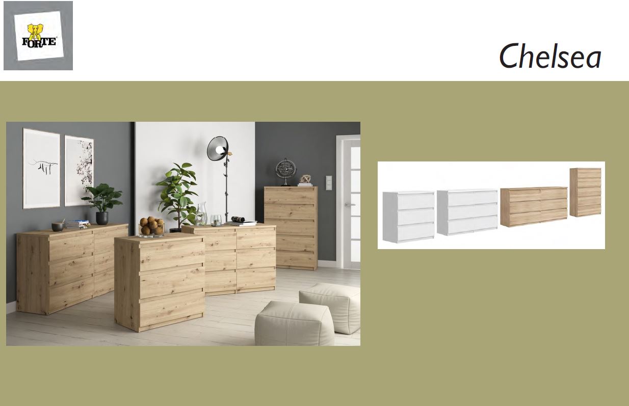 Komoda Chelsea v dekoru dub artisan je praktickým a moderním doplňkem do ložnice, obývacího pokoje nebo předsíně. Patří do kolekce ForQuick, která je navržena s důrazem na rychlou a jednoduchou montáž, díky čemuž si můžete snadno a rychle zařídit různé části domácnosti. Komoda nabízí šest zásuvek, které poskytují dostatek úložného prostoru pro oblečení, dokumenty nebo další domácí doplňky. Bezúchytková čela dodávají nábytku čistý a minimalistický vzhled. Konstrukce z nábytkové desky potažené fólií zajišťuje pevnost a odolnost při každodenním používání.
