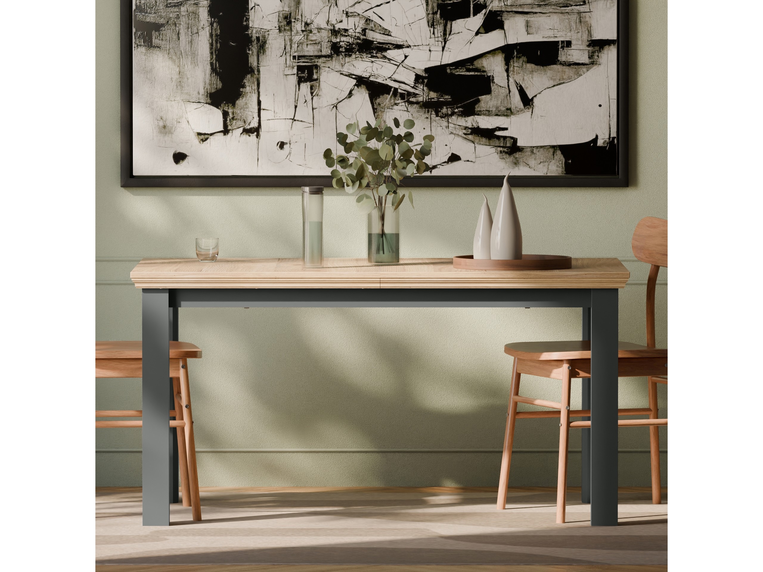 Deska je vyrobena z kvalitní nábytkové desky s přírodním vzhledem dřeva. Stůl je k dispozici ve dvou elegantních variantách: Bílá / Dub Riva nebo Dub Mauvella / Uni Wolfram Šedý. Oba dekory jsou navrženy tak, aby ladily s ostatními prvky kolekce Pontypool.