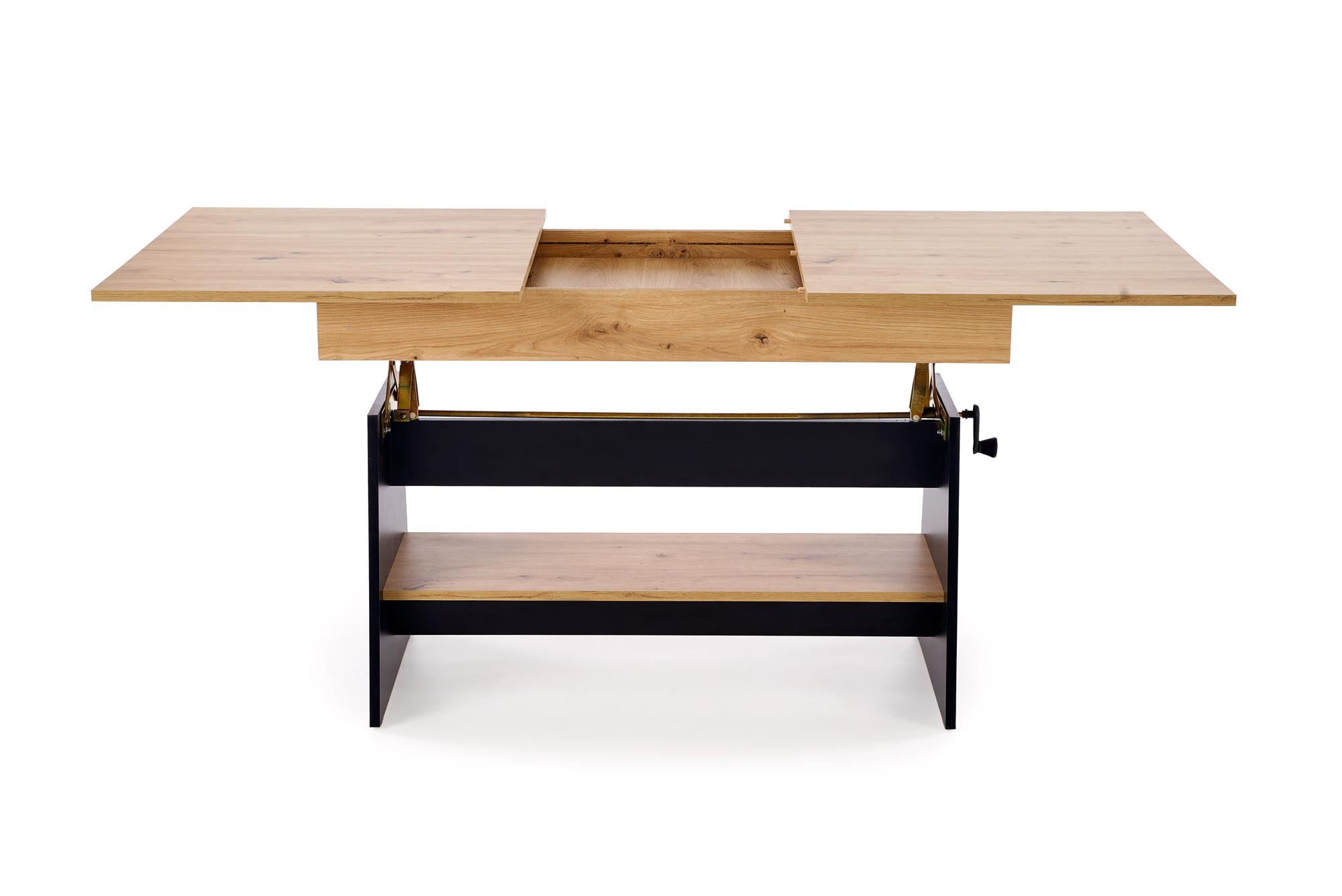 Rozměry jsou 120–160/70/61–72 cm. Jedná se o rozkládací konferenční stůl s možností zvýšení výšky. Vyroben je z laminované nábytkové desky v odstínu dub artisan/černá, takže působí teple a přirozeně a dobře zapadá do moderních i tradičních interiérů