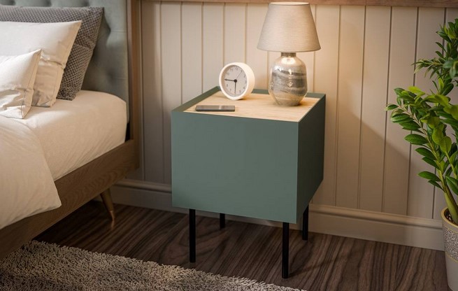 Minimalistický noční stolek ze série Olmo představuje elegantní doplněk moderního obývacího pokoje nebo ložnice. Kombinuje matné provedení v olivové barvě s dekorem dubu, což vytváří harmonický a nadčasový vzhled. Konstrukce je navržena s důrazem na čisté linie a funkčnost, přičemž bezúchytkové řešení podtrhuje moderní charakter nábytku. Stolek stojí na kovových nožkách, které mu dodávají lehkost a zároveň usnadňují úklid pod nábytkem. Nábytek je dodáván v balení pro vlastní montáž včetně přehledného montážního návodu.