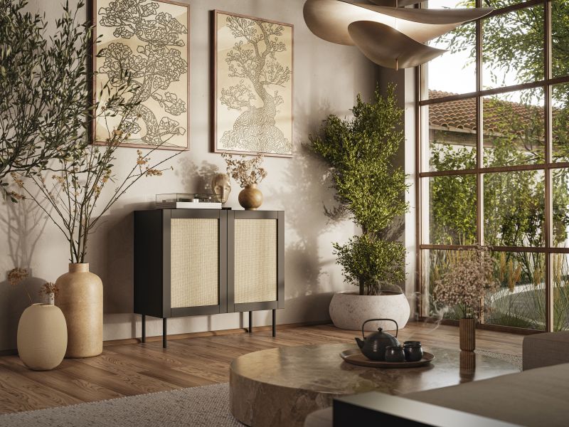 Komoda z kolekce Juta je moderní a elegantní kus nábytku, který vyniká kontrastním spojením béžových a černých čel s matným povrchem. Bezúchytkové provedení podtrhuje čistý minimalistický styl a umožňuje pohodlné otevírání dvířek tahem. Texturovaný povrch dodává komodě vizuální hloubku a luxusní vzhled. Vnitřní prostor se dvěma policemi nabízí praktické řešení pro uložení oblečení, doplňků nebo domácích potřeb. Kovové nožky o výšce 20 cm zajišťují stabilitu a zároveň usnadňují úklid pod nábytkem. Komoda je dodávána v demontovaném stavu pro vlastní montáž a fotografie ukazují i další prvky kolekce, které jsou prodávány samostatně.