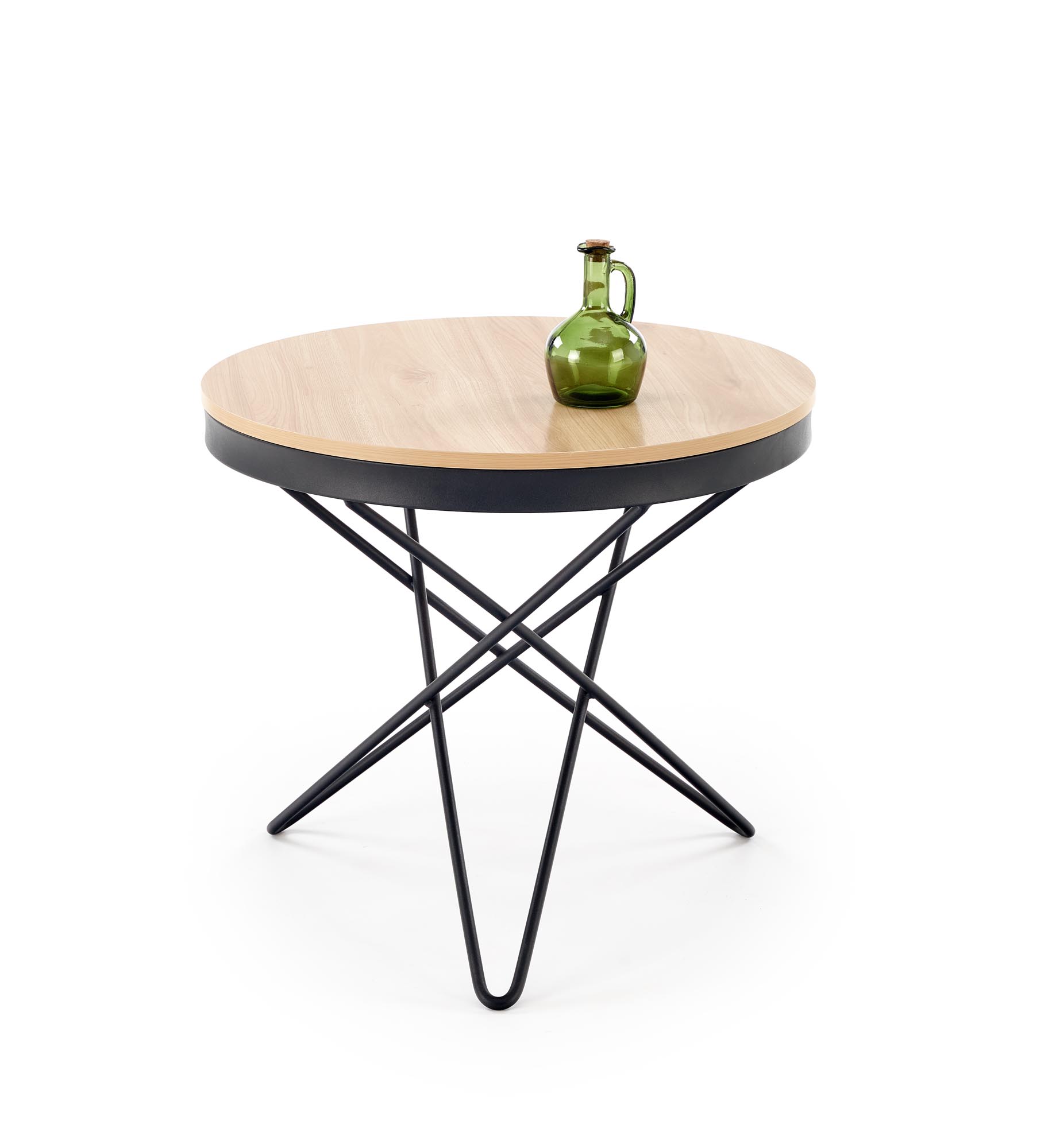 Moderní konferenční stolek v kombinaci přírodního dekoru a černé barvy představuje elegantní a nadčasové řešení pro současné interiéry. Kulatá deska s matným povrchem z MDF s melaminovou úpravou působí přirozeně a harmonicky, zatímco kovová konstrukce s černým práškovým lakováním dodává stolku stabilitu a moderní charakter. Díky jednoduchému designu se stolek skvěle hodí do obývacího pokoje, ložnice i moderního pracovního koutku.