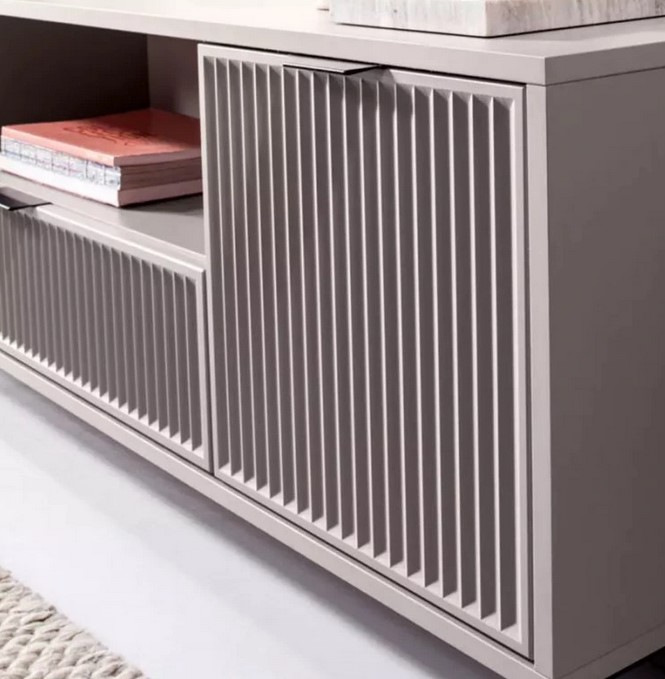 Elegantní linie béžové komody LinkaStyle LS2 Cashmere přirozeně zapadnou do každého moderního interiéru. Komoda působí jemně, vkusně a zároveň velmi nadčasově, díky čemuž se skvěle hodí jak do moderních, tak i skandinávsky laděných prostor. Neutrální béžová barva se snadno kombinuje s ostatními odstíny i materiály a vytváří harmonický celek. Komoda nabízí praktické úložné řešení v podobě dvou skříněk a tří zásuvek umístěných pod hlavní odkládací plochou. Díky tomu poskytuje dostatek prostoru pro oblečení, knihy, dokumenty i dekorace. Povrch komody zdobí jemné výřezy a nenápadné černé úchytky, které podtrhují moderní charakter nábytku a dodávají mu elegantní detail.