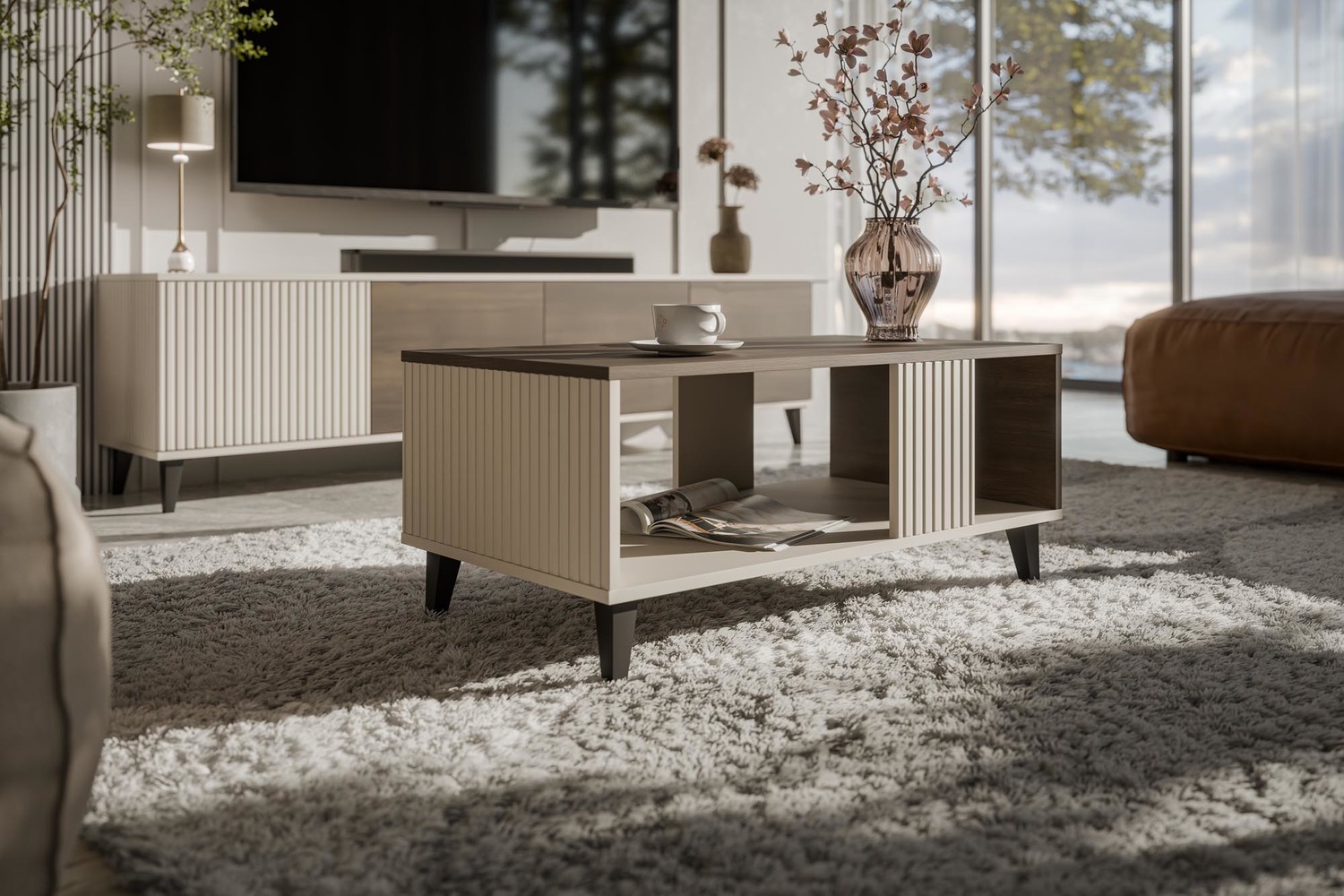 Kolekce Random 2 nabízí svěží, moderní design spojený s praktičností. Tento konferenční stolek je navržen tak, aby ladil s různými interiéry — od obývacích pokojů po moderní pracovní kouty. Kombinace odstínů kašmíru, ořechu a černé působí elegantně a současně útulně. Spodní police poskytuje dodatečný úložný prostor, zatímco vyšší nožky dodávají lehký vizuální efekt a usnadňují úklid.