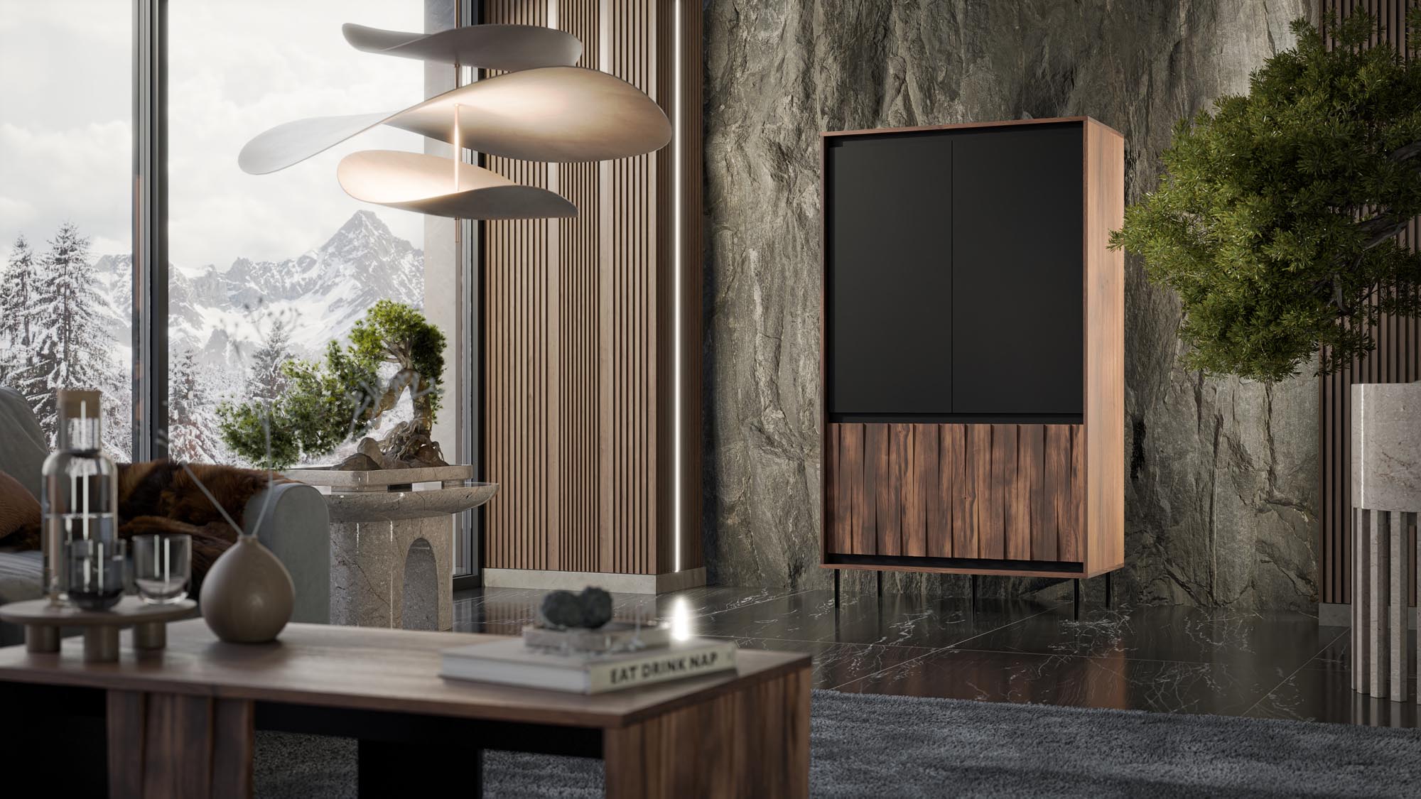 Matná černá v kombinaci s ořechovými detaily vytváří harmonickou kompozici a dodává místnosti moderní a stylový charakter. Jde o kombinaci klasické elegance a moderního designu.