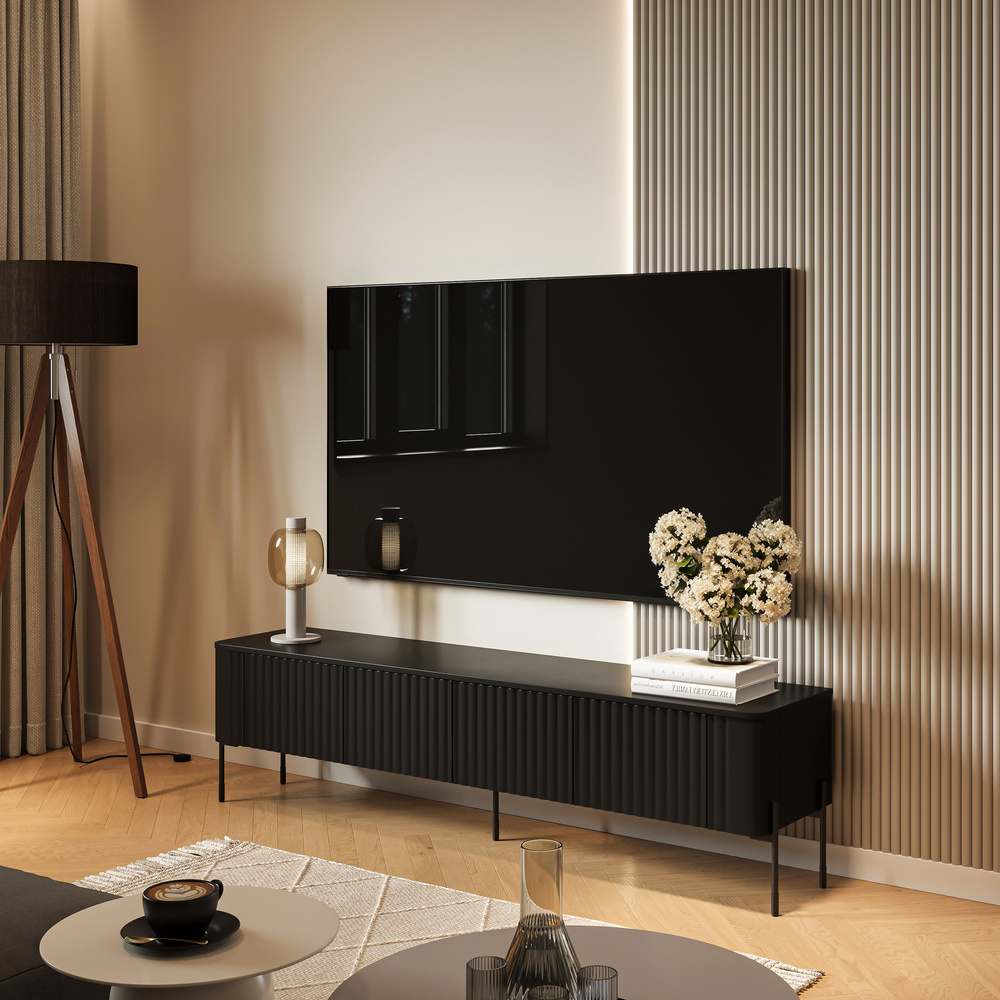TV stolek Aria v matně černé barvě dokonale doplňuje dubové podlahy, industriální doplňky a tlumenou barevnou paletu. Pro vylepšení interiéru jej zkombinujte se zrcadlem s kovovým rámem, atmosférickým osvětlením a keramickými akcenty v odstínech béžové a zlaté. Na něj lze umístit elegantní lampu, designové knihy nebo jemné dekorace a vytvořit tak stylový a útulný multimediální koutek.