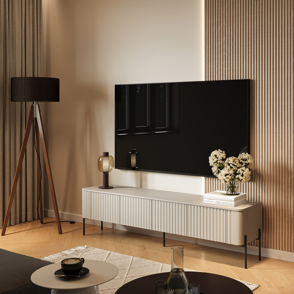 TV stolek Aria v kašmírové barvě dokonale doplňuje dubové podlahy, industriální doplňky a tlumenou barevnou paletu. Pro vylepšení interiéru jej zkombinujte se zrcadlem s kovovým rámem, atmosférickým osvětlením a keramickými akcenty v odstínech béžové a zlaté. Na něj lze umístit elegantní lampu, designové knihy nebo jemné dekorace a vytvořit tak stylový a útulný multimediální koutek.