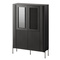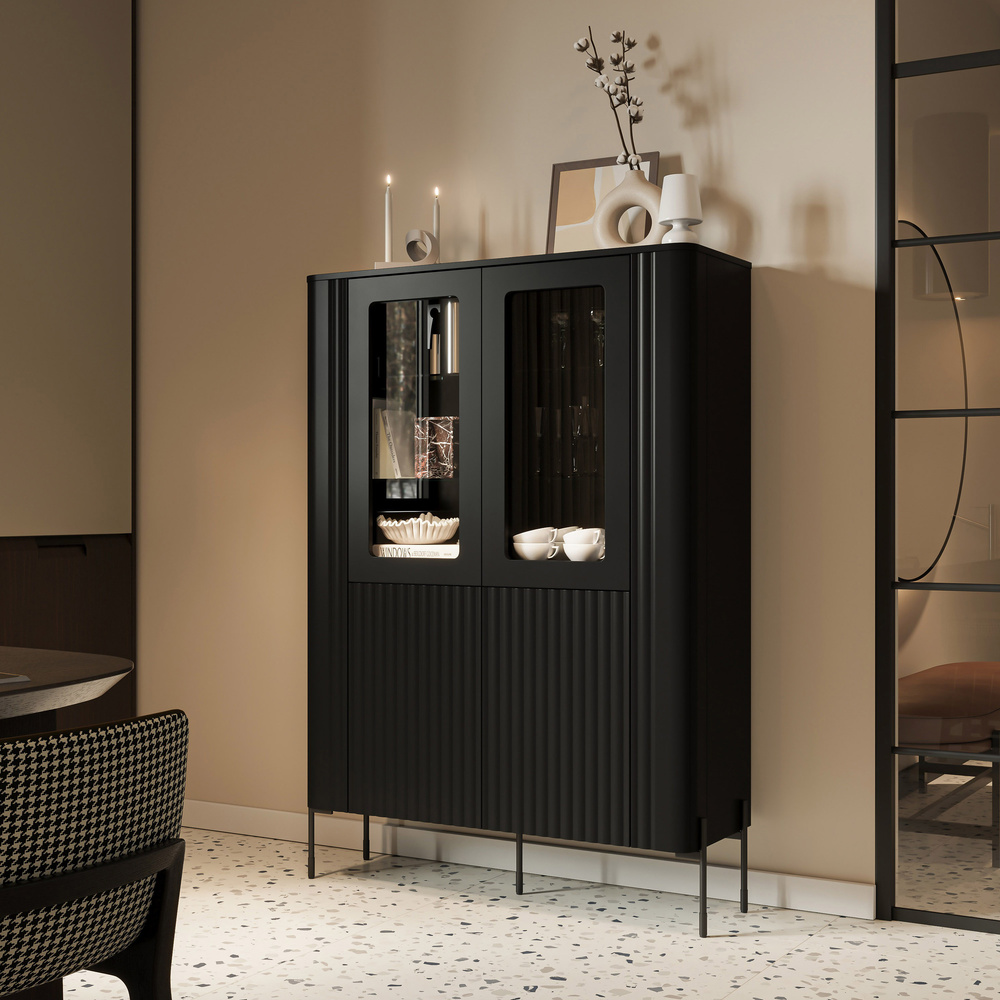 Vitrína Aria v černém odstínu se dokonale hodí k tmavému dřevu, mramoru a zlatým akcentům a vytváří tak sofistikovaný prostor. V jídelně bude skvěle doplňovat dřevěný stůl a čalouněné židle a v obývacím pokoji může sloužit jako stylová vitrína na knihy a dekorace. Na jejím vrchu budou skvěle vypadat keramické vázy, svíčky nebo minimalistické sochy, které dodají interiéru charakter.
